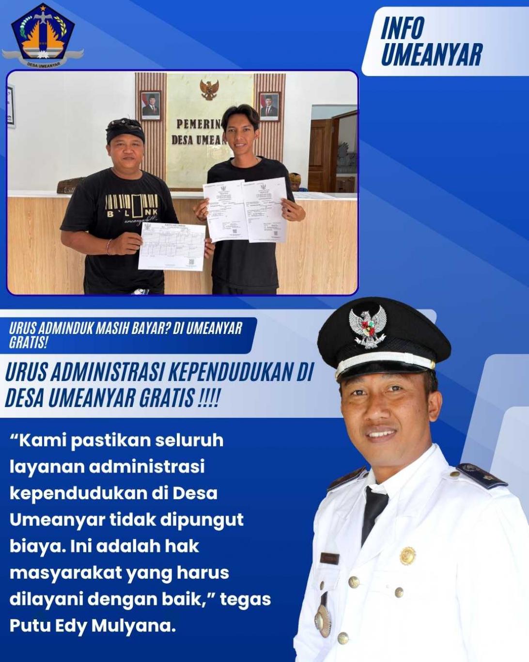 “Kami pastikan seluruh layanan administrasi kependudukan di Desa Umeanyar tidak dipungut biaya. Ini adalah hak masyarakat yang harus dilayani dengan baik,” tegas Putu Edy Mulyana.